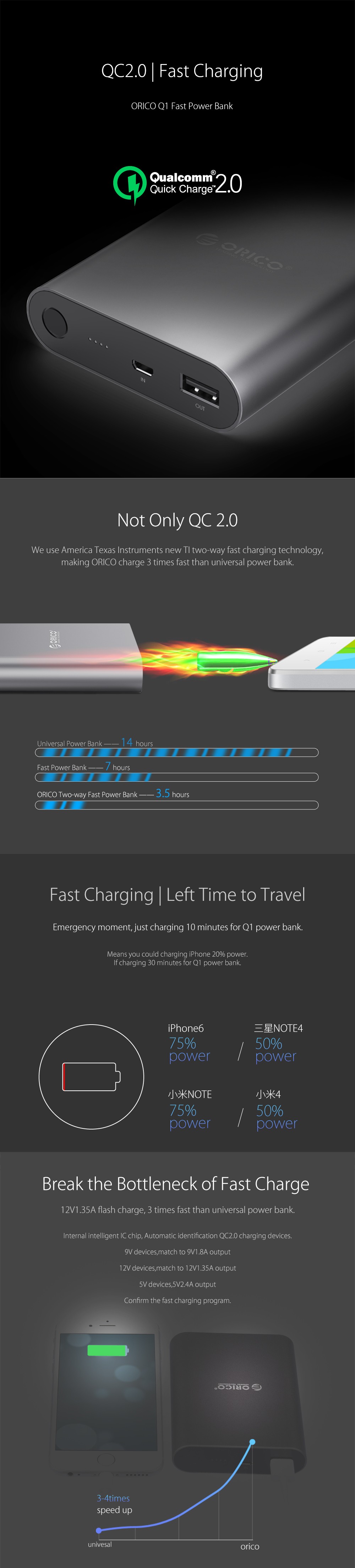 Интегрирована с QC2.0, заряжает до 75% быстрее, чем стандартное зарядное устройство