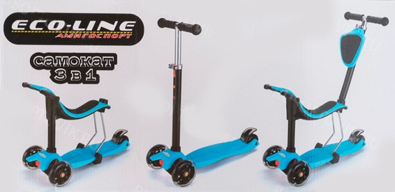 Самокат Ecoline Onex 3D 3 в 1 имеет 3 этапа трансформации: каталка с сиденьем и родительской ручкой для детей от 12 месяцев, каталка без родительской ручки для детей от 15 месяцев, самокат с высоким рулем для детей от 36 месяцев.