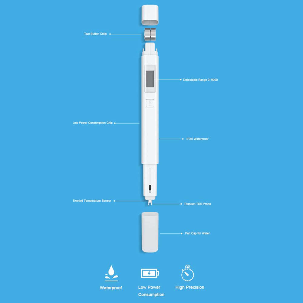 В целях экономии заряда батареи TDS тестер автоматически выключается при неиспользовании более двух минут. В качестве источника питания используются две круглые батареи AG13, которые можно самостоятельно заменить в любой момент. Устройство весит всего 27,4 г и имеет компактный дизайн в форме шариковой ручки, благодаря чему его удобно брать с собой.