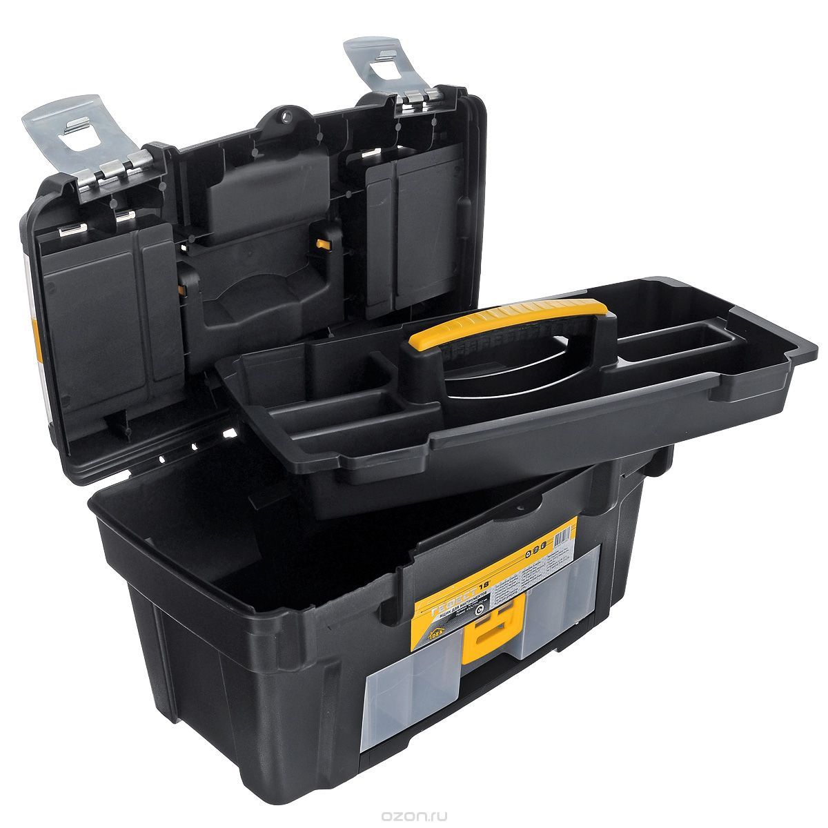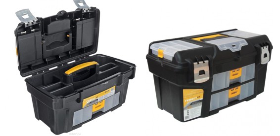 Ящик с органайзером снабжен металлическими замками, что продлевает срок службы и делает запирание более надежным. Используется для хранения и переноса инструментов, мелких деталей.