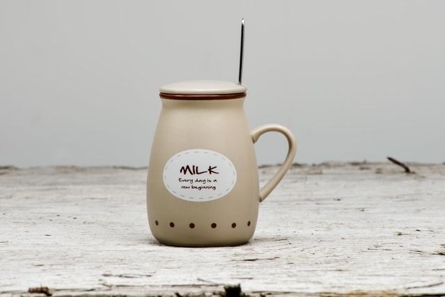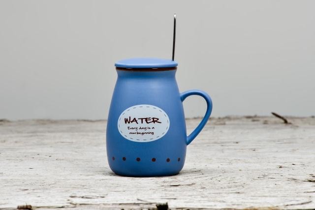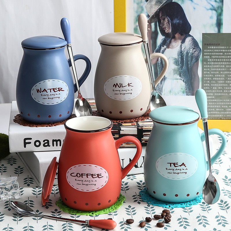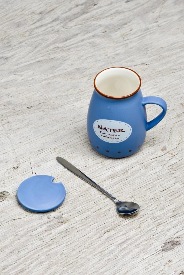 Керамические кружки с деревянной крышкой и металлической ложкой с принтом в виде надписи.