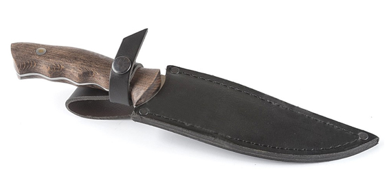 Чехол-ножны сделан из натуральной кожи, скроен под форму клинка. Нож надежно фиксируется в чехле плотной металлической кнопкой. Имеет петлю для фиксации на ремне. Клинок украшен рисунком, сделанным вручную методом двойного травления.