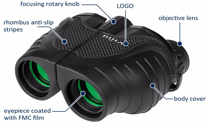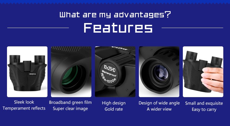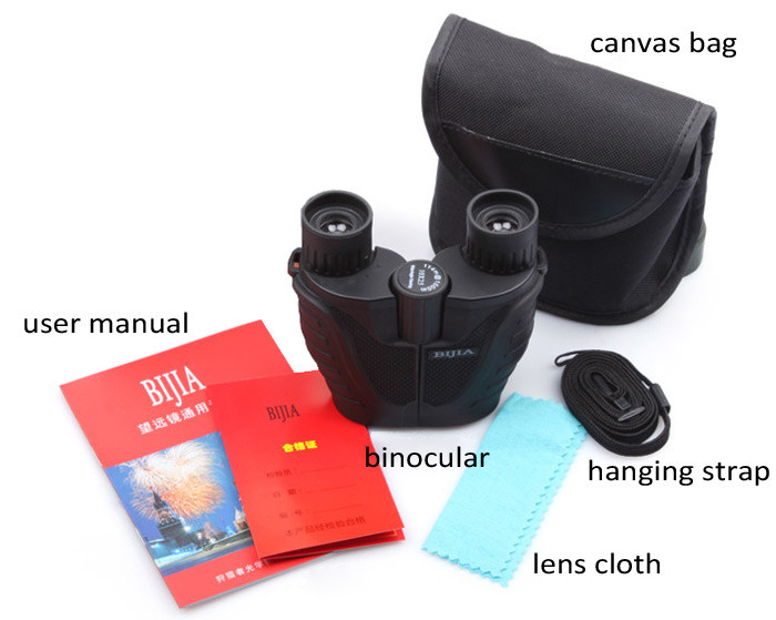Комплект поставки: 1 х BIJIA 10x25 бинокль, 1 х сумка для хранения, 1 x висит верёвка, 1 x ткань для объектива, 1 х руководство пользователя