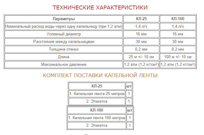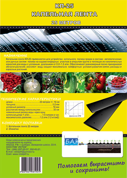 Капельная лента - применяется для устройства капельного полива грядок в составе автоматических или ручных систем полива на садово-огородных участках в открытом грунте и теплицах из накопительных емкостей для воды с условным давлением от 0,2-1,2 атм. Обеспечивает равномерный полив прикорневой области растений, экономит воду, создает максимально комфортные условия развития семян, рассады и взрослых растений.