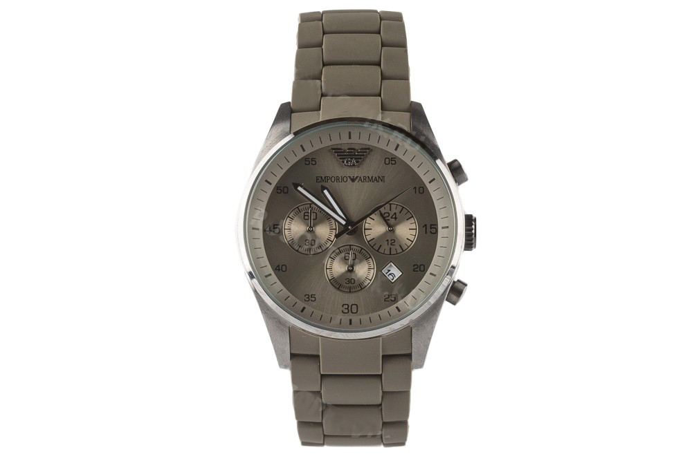 Хит продаж – идеальная реплика часов Emporio Armani. Корпус выполнен из литого металлического сплава, браслет покрыт матовым полиуретаном, наощупь похож на силикон. Циферблат соответствует оригиналу, хронограф работает, дата переключается во время. Механизм кварцевый, стекло каленое, управление одной заводной головкой, на которой есть фирменная гравировка. Застежка «Бабочка» надежно фиксирует браслет на запястье.