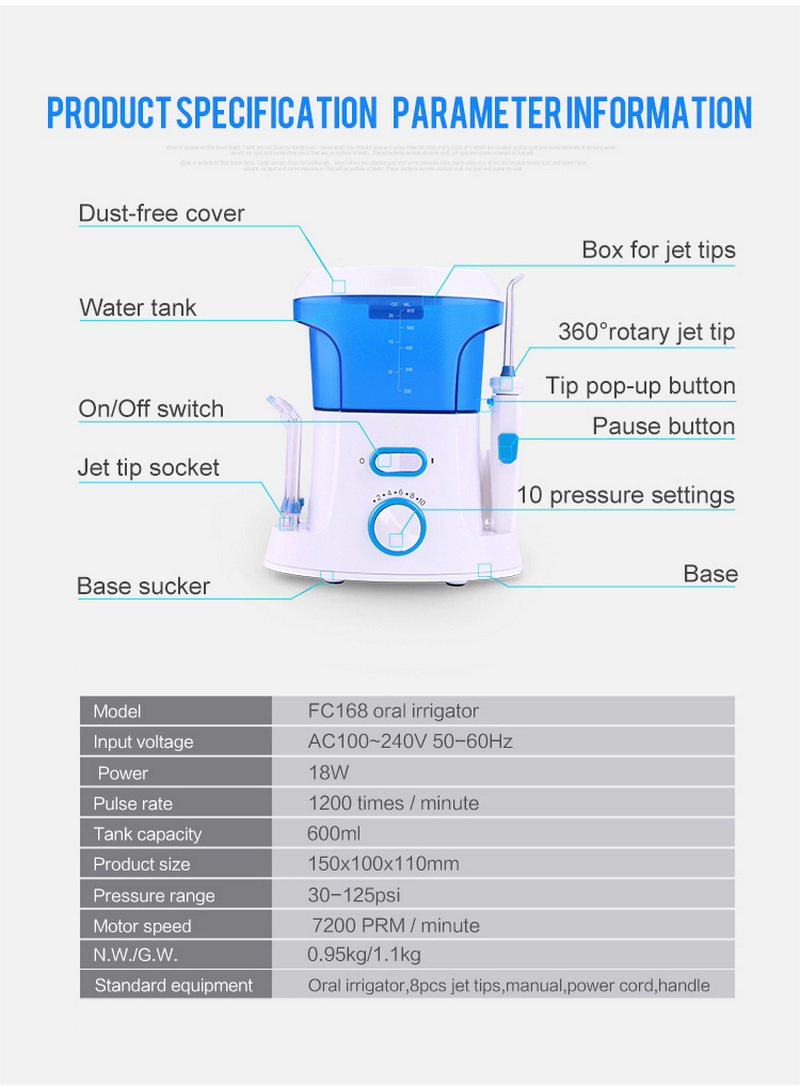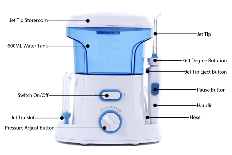 Итак, прежде всего, нужно отметить, что для действительного положительного эффекта, ирригатор полости рта следует использовать в комплексе с остальными средствами гигиены, такими, как зубная щетка, паста или порошок, флосс и другими. Ну, а само чудо-устройство – это простой набор ирригации – миниатюрный гидронасос с регулируемым напором, емкость для жидкости и (обычно) набор чистящих насадок.