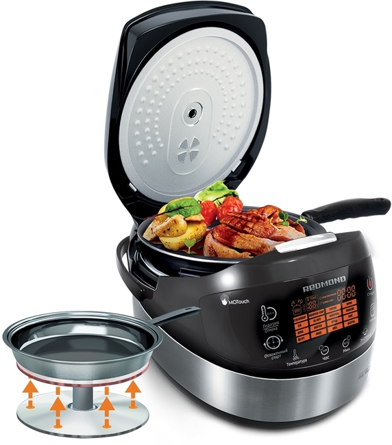 Redmond RMC-FM91 обладает широчайшим набором удобных настроек, поэтому любой, самый изысканный гурман найдет для себя в ней то, что необходимо. Сорок пять программ, среди которых семнадцать имеют автоматическую настройку, и двадцать восемь настроек, позволяющих владельцу этой модели корректировать управление на свое усмотрение. Среди прочих программных полезностей данной модели нельзя не отметить сенсорные кнопки управления меню, которые обеспечат не только эстетическое удовольствие во время приготовления, но и после него, ведь такие панели практически не пачкаются и для очистки достаточно протирать их влажной тряпкой или губкой. Redmond RMC-FM91 комплектуется весьма внушительным набором аксессуаров, среди которых вы обнаружите сковороду и даже корзину для жарки на фритюре, а также книгу рецептов, ложки, щипцы-ухват, кабель питания, инструкцию и мерный стакан.