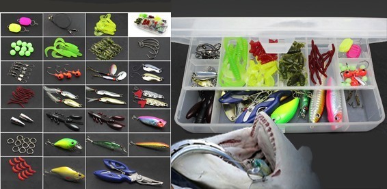 Включает в себя разные виды приманок, плоскогубцы, направляющие кольца, рыболовные крючки и другие аксессуары.